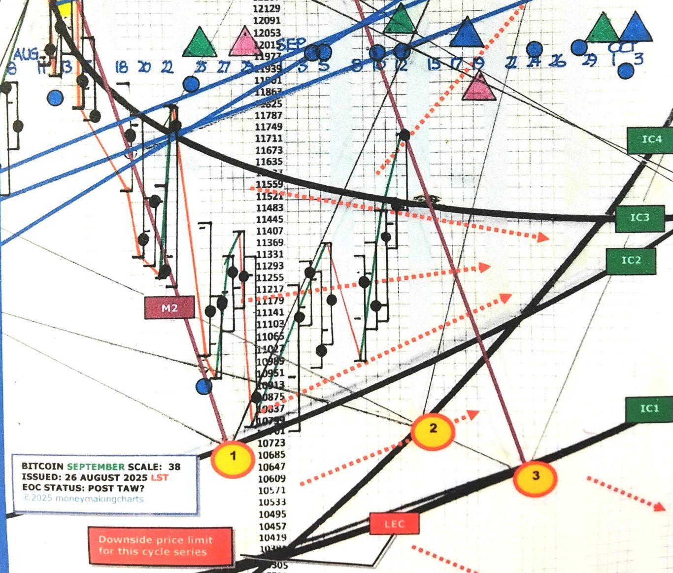 Bitcoin made a major top on 14th August 2025 at a major overhead resistance line, signalling a short trade at around 125000 (top left of chart). The M1 line is a powerful down force line and dragged price down to strong support from IC2, signalling a reversal from short to long around 109000. Accurate support and resistance lines greatly assist traders'.
