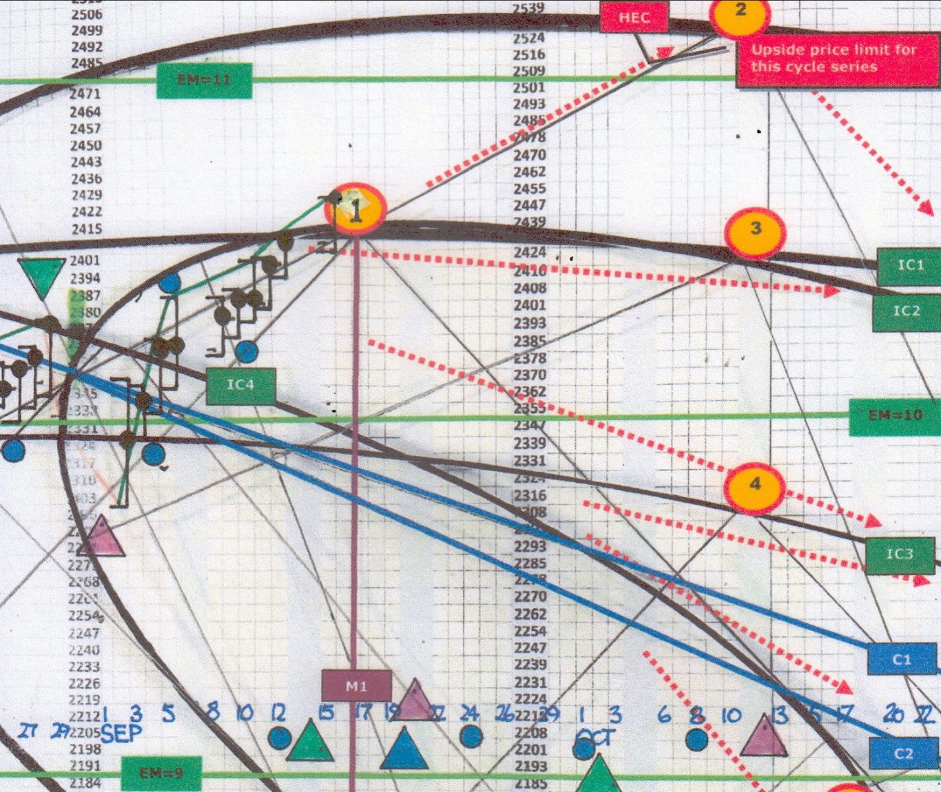 - The top on 17th October occurred at our exclusive EM timing cycles showing in our charts as coloured triangles. A blue & green triangle also occurred at the top of 6th October and bottom at 14th October.