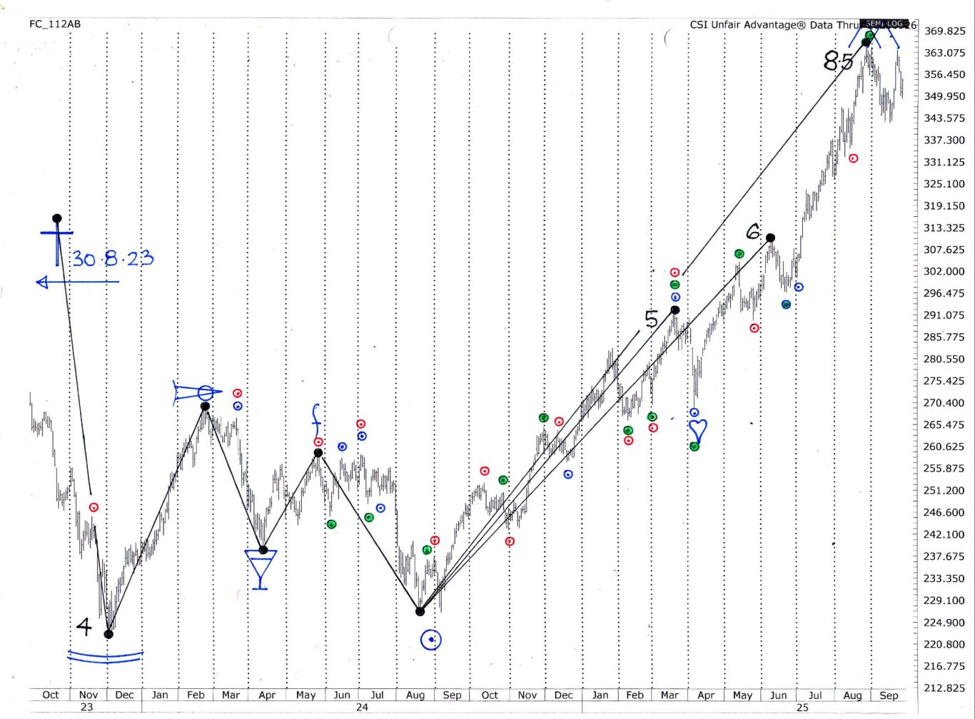 Hi-Tech Charts are multi-faceted, containing tools to suit almost every trading style, from day trading, to medium term trend following, swing trading, options, and long term position trading. Included in our daily bulletin is a chart presenting each market's bull-bear-bull cycle. At left is Silver showing the segment from its bear market bottom (December 2021) to the September 2025 top. These charts help longer term traders, showing what part of a cycle a market is in. Not only that, they demonstrate the power of our indicators. The coloured triangle in the Hi-Tech Charts appear as small coloured circles in the Silver chart at left, and it can be seen almost all fall on major tops & bottoms, or accelerate to trend.