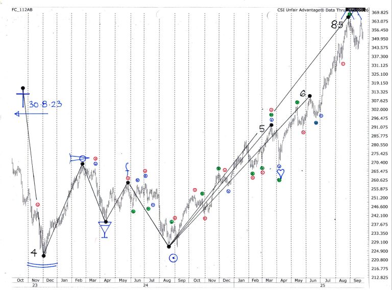 The mathematics of elliptical cycles control 3 dimensions - time, price and trend angle. This is demonstrated in the Silver chart at right. The black lines joining tops to bottoms and vice versa, represent multiples of our cycles on the vertical axis, or price. It can be seen how many major moves travel specific cycle multiples, e.g. from the August 2024 bottom Silver made tops at cycle multiples of 5, 6, & 8.5.